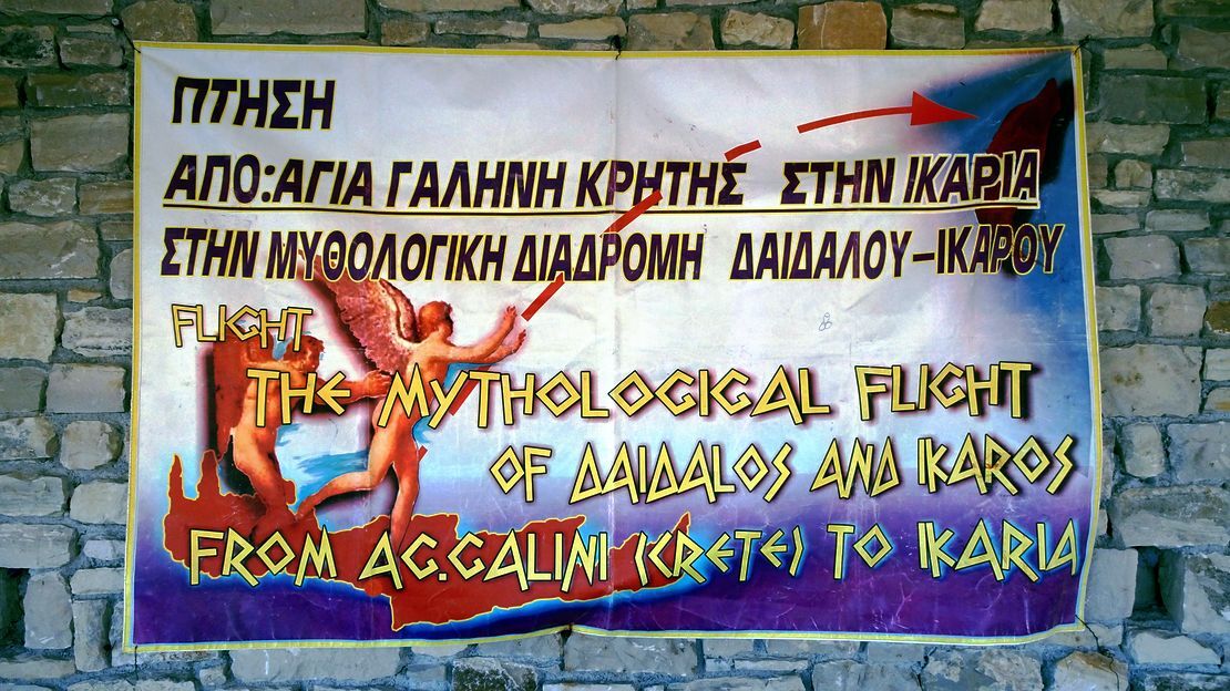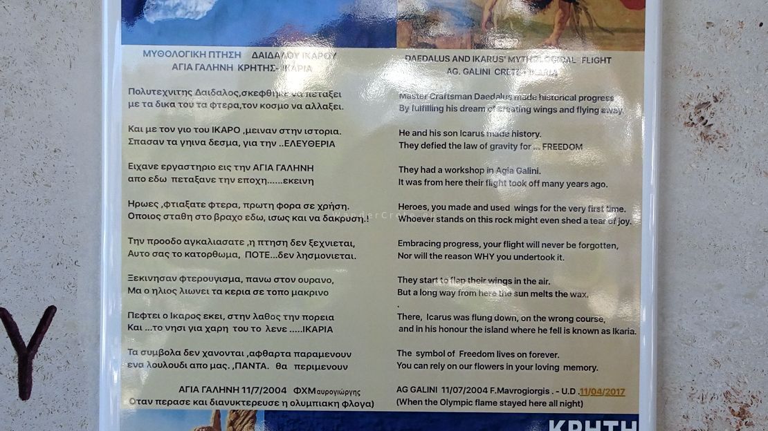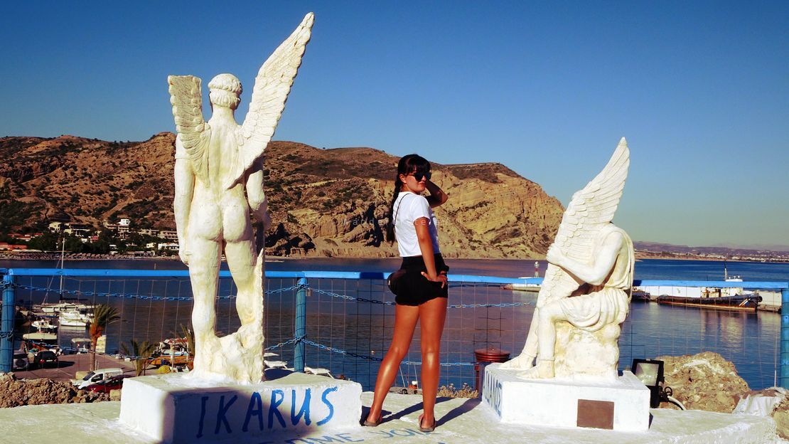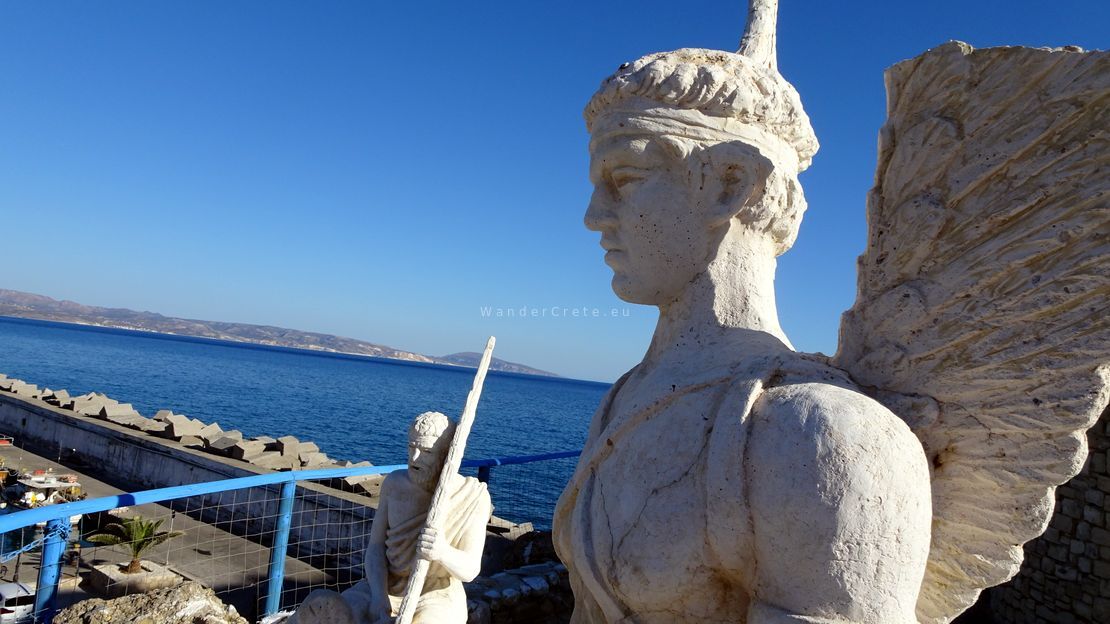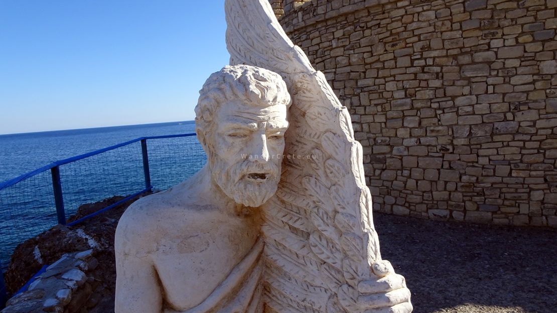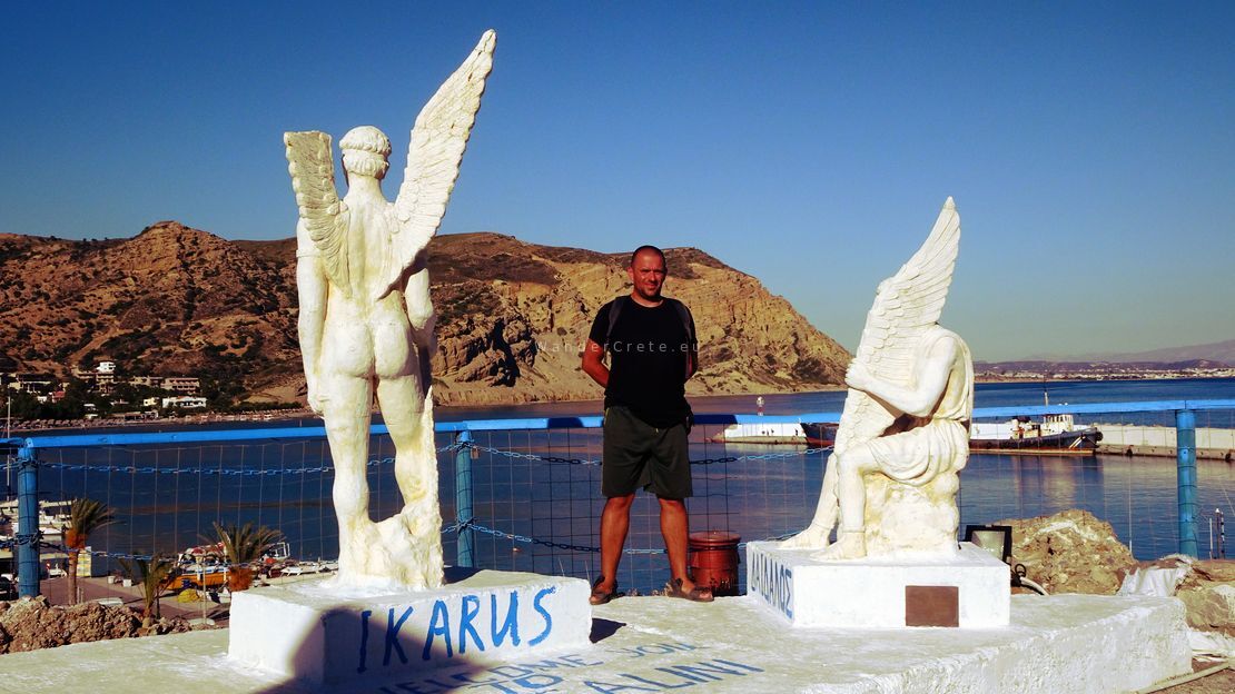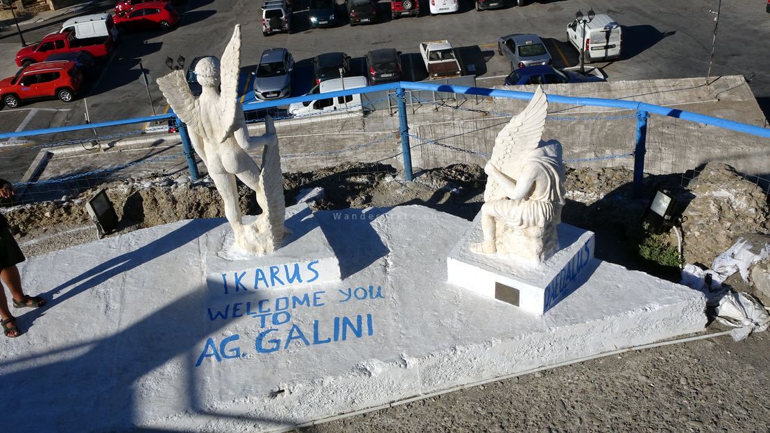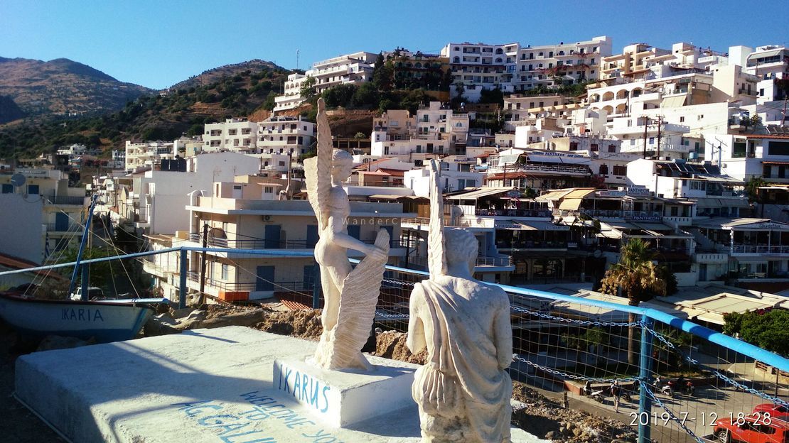 The name Agia Galini means “Holy Serenity,” and the town wears it well. But its past is anything but quiet. According to legend, Daedalus and Icarus took flight from these cliffs, fleeing the wrath of King Minos. There’s even a sculpture overlooking the sea — a tribute to that ancient escape, reminding us how myth breathes through the rocks and wind of Crete.